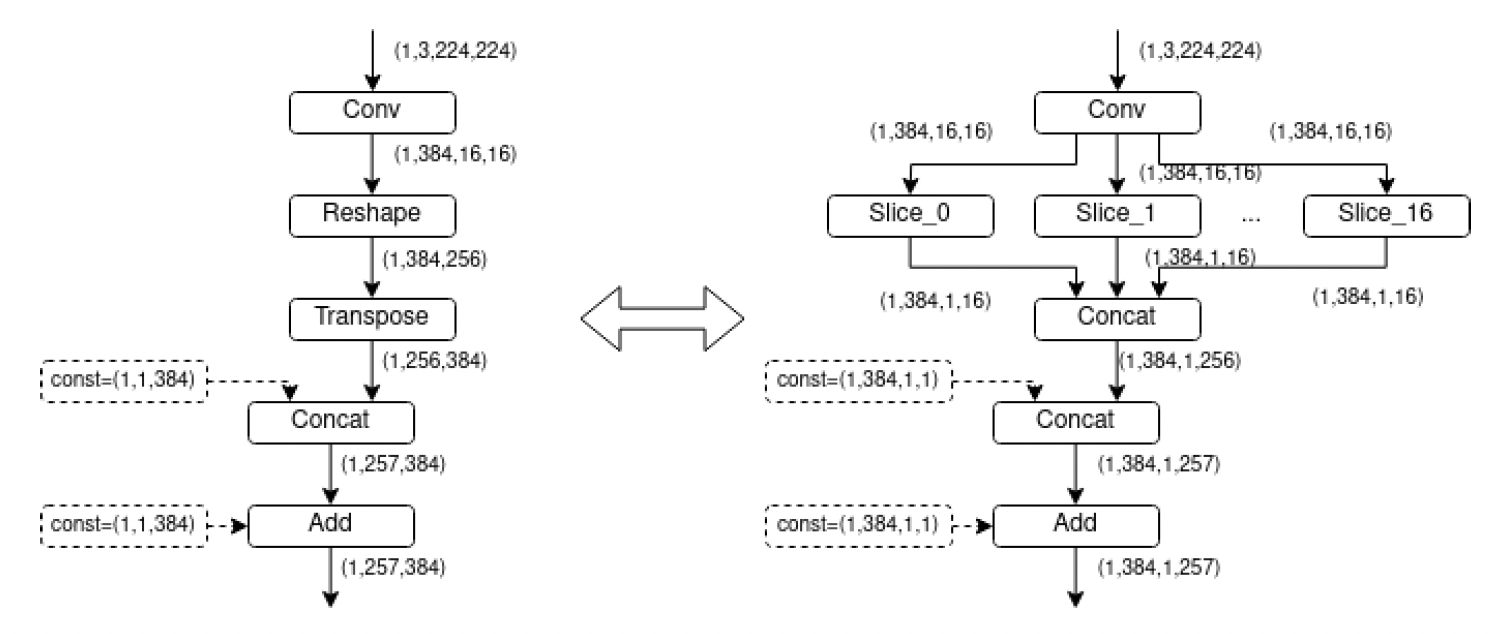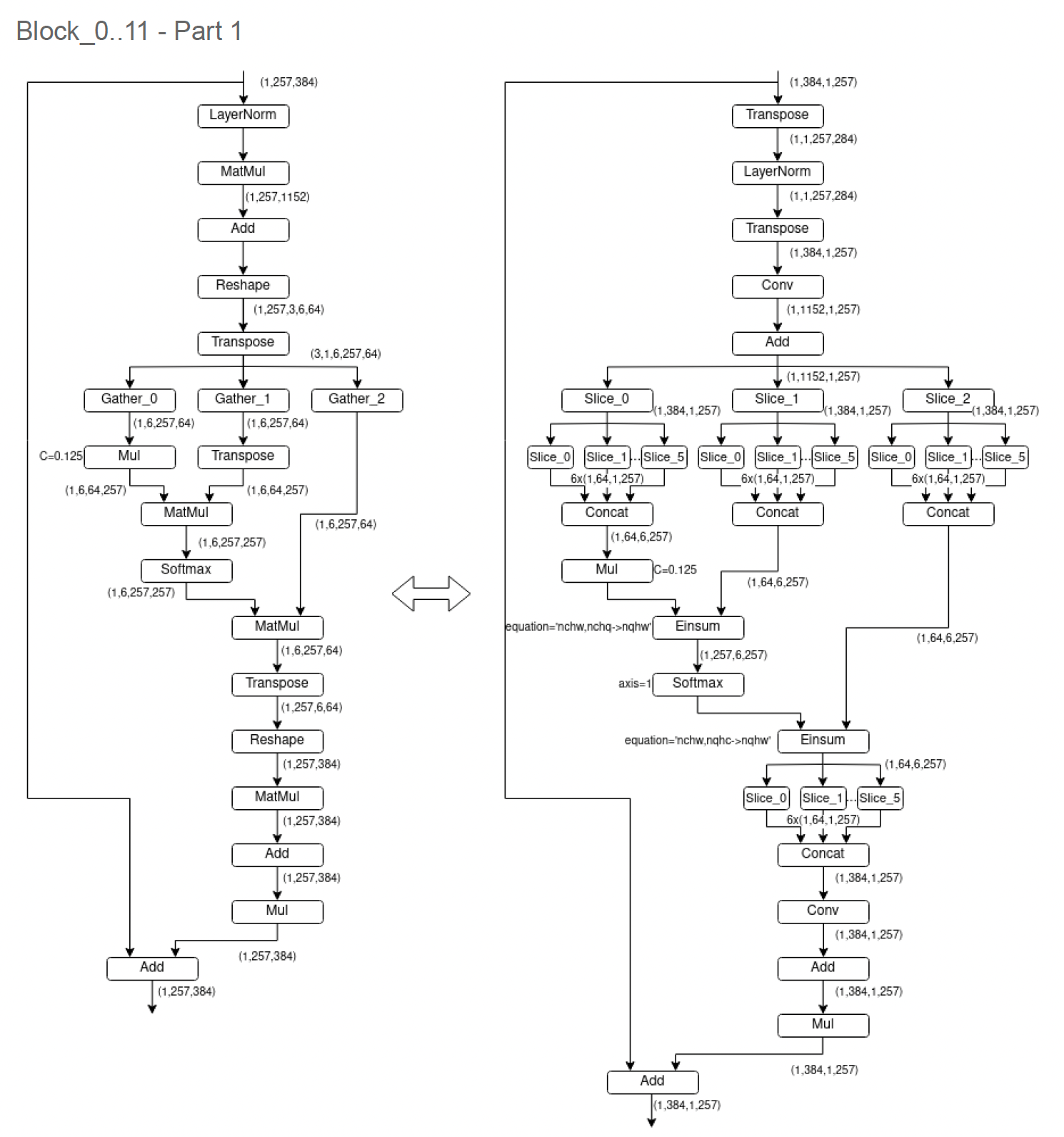 This block is a preprocessing block prior to the sequence of Transformer blocks. The figure below provides the topology of the original model and the optimized model which can be fully mapped to the MLA backend.
