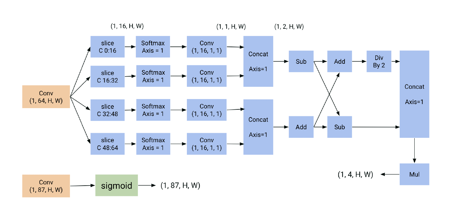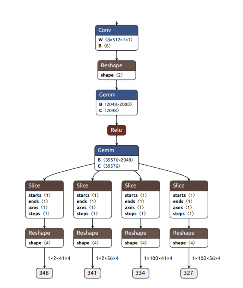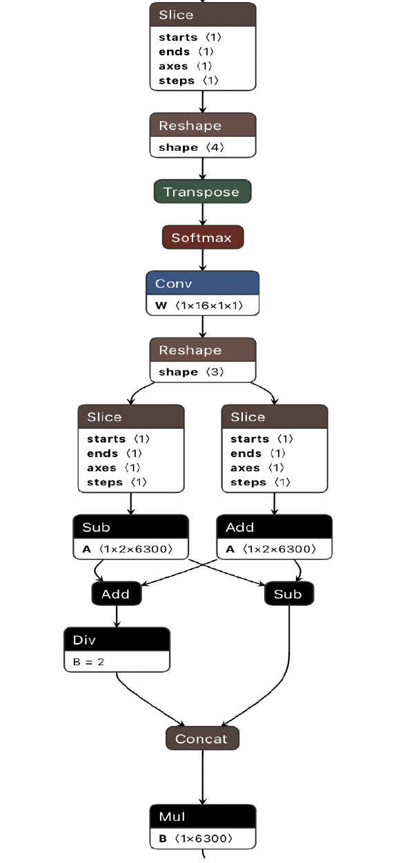 The last few layers of the model in Netron are shown in the figure below. There are 5 reshape nodes which are not yet supported by the MLA; hence they are mapped to the CVU. Those 4 slice nodes after reshape process tensors in 2D; they are mapped to the APU because the MLA only supports 4D. To modify the model so that it is mapped entirely to the MLA, we need to remove unsupported operators and modify 2D tensors to 4D.