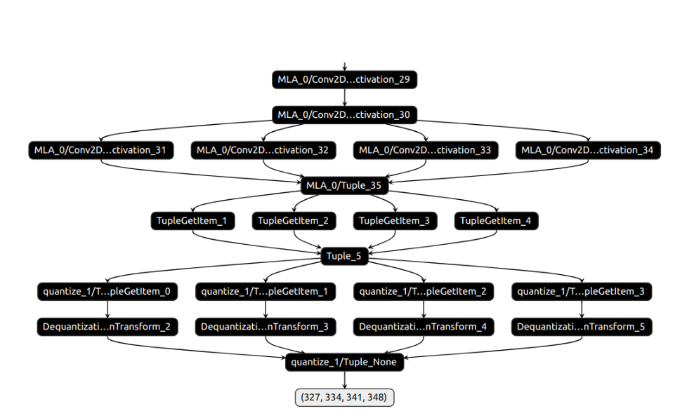 The image below shows the rewritten model fully mappable to the MLA. The shaded layer cannot be supported on the MLA. This node should be removed and the model’s output needs to be converted to compensate for shape mismatch.