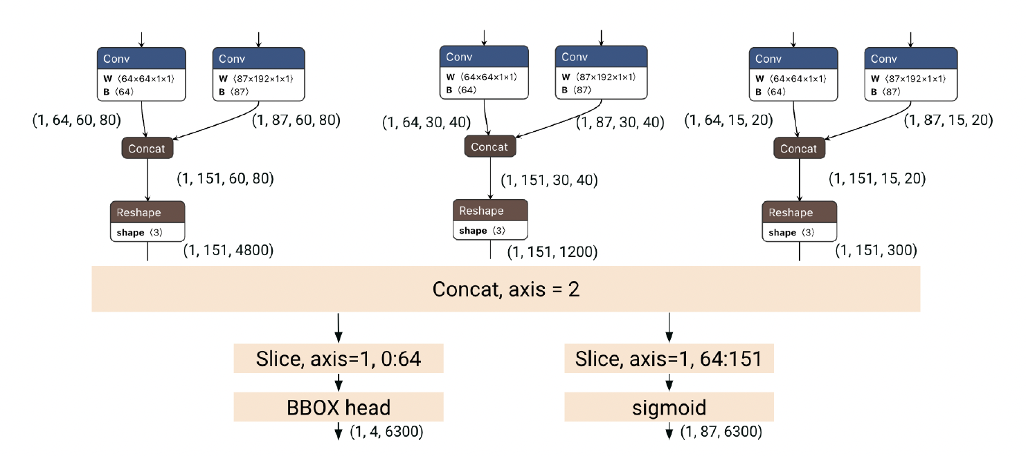 The class probability tensor of shape (1, 87, 6300) is output as 3 tensors after sigmoid: (1, 87, 60, 80), (1, 87, 30, 40), and (1, 87, 15, 20). In NHWC layout, as is the case for MLA, when these 3 tensors, (1, 60, 80, 87), (1, 30, 40, 87), and (1, 15, 20, 87), are stored contiguously in the memory, they are the same as one (1, 6300, 87) tensor in NHWC.