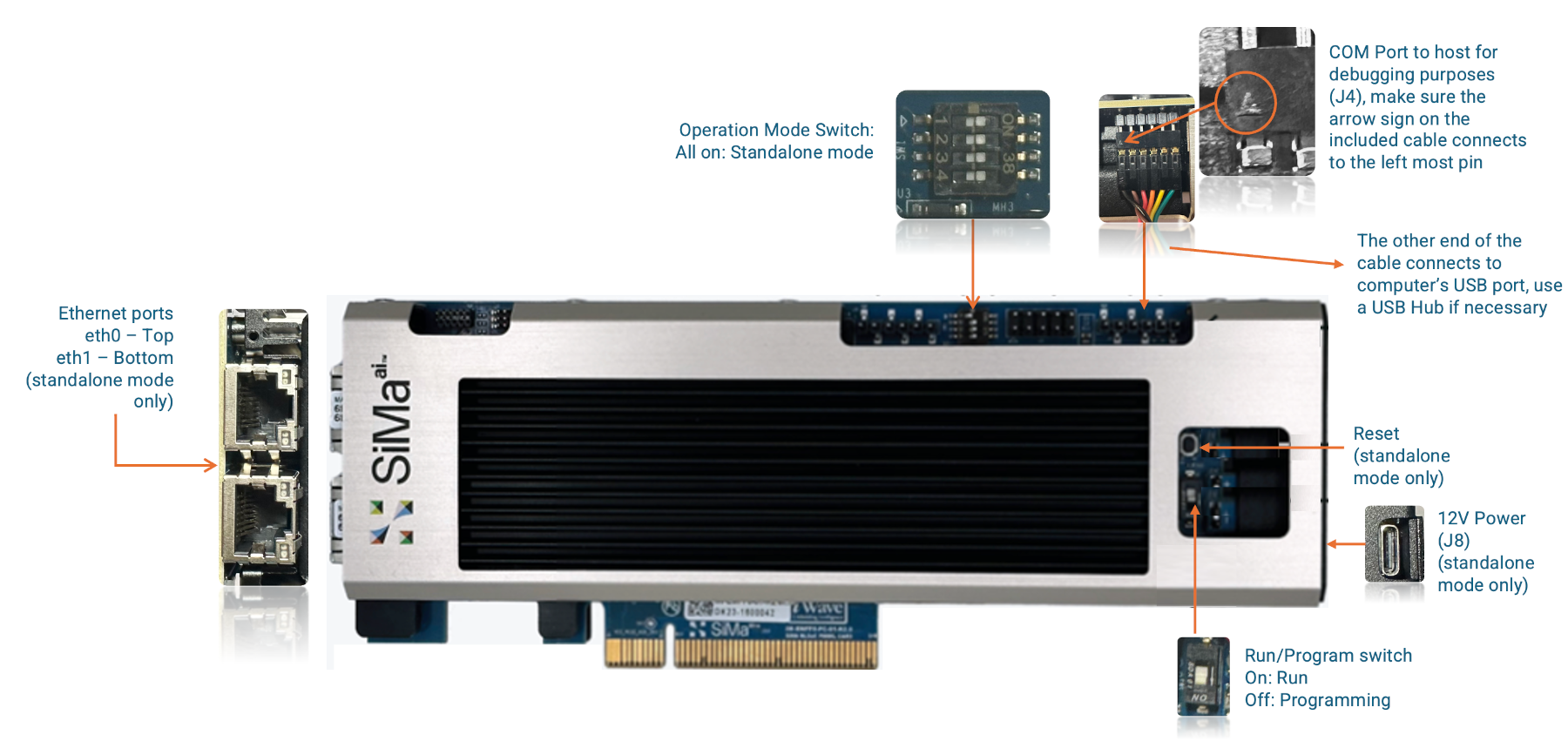 Make sure the Operation Mode Switch, Run/Program Switch are set according to the diagram above then power on the DevKit. Use the included serial cable to connect the DevKit to your computer: