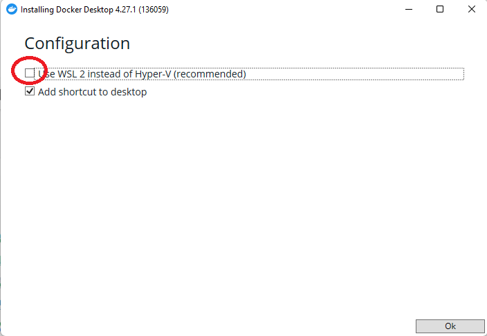 In the Configuration window, do not click in the first checkbox, thereby the Hyper-V option will be enabled in the Docker Desktop application.