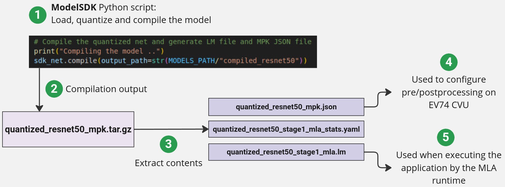 The output of a compiled model in the ModelSDK is a tar.gz model that contains the compiled model, metadata in the form of a _mpk.json file and a stats file.