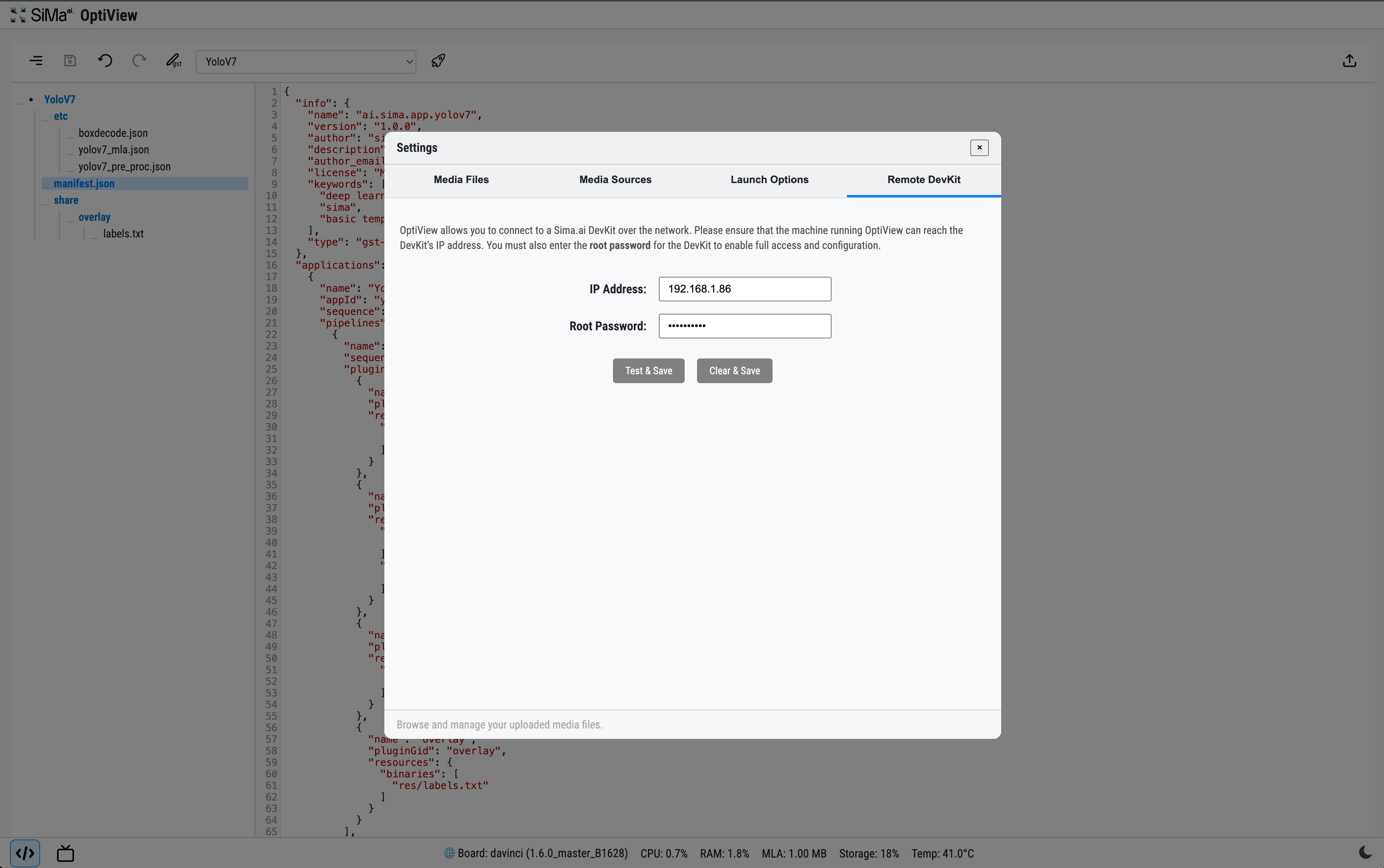 OptiView can connect to any remote DevKit over the network, regardless of the platform it is installed on. Upon launch, users are prompted to enter the IP address and root password of the target DevKit to establish the connection. For the default root password, contact support@sima.ai.