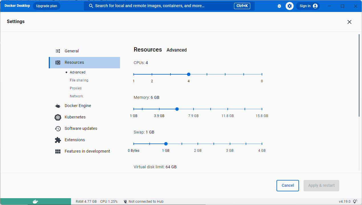 Launch the Docker Desktop application and open settings. Under resources, increase the memory to 6 GB as shown in the below image and choose